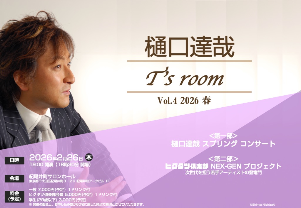 「ヒグタツ王子」こと樋口達哉のコンサートと、新進気鋭の若手アーティスト育成プロジェクト「NEX-GEN」のコーナーの二部構成で、皆様と楽しいひとときを過ごせれば幸いに存じます。